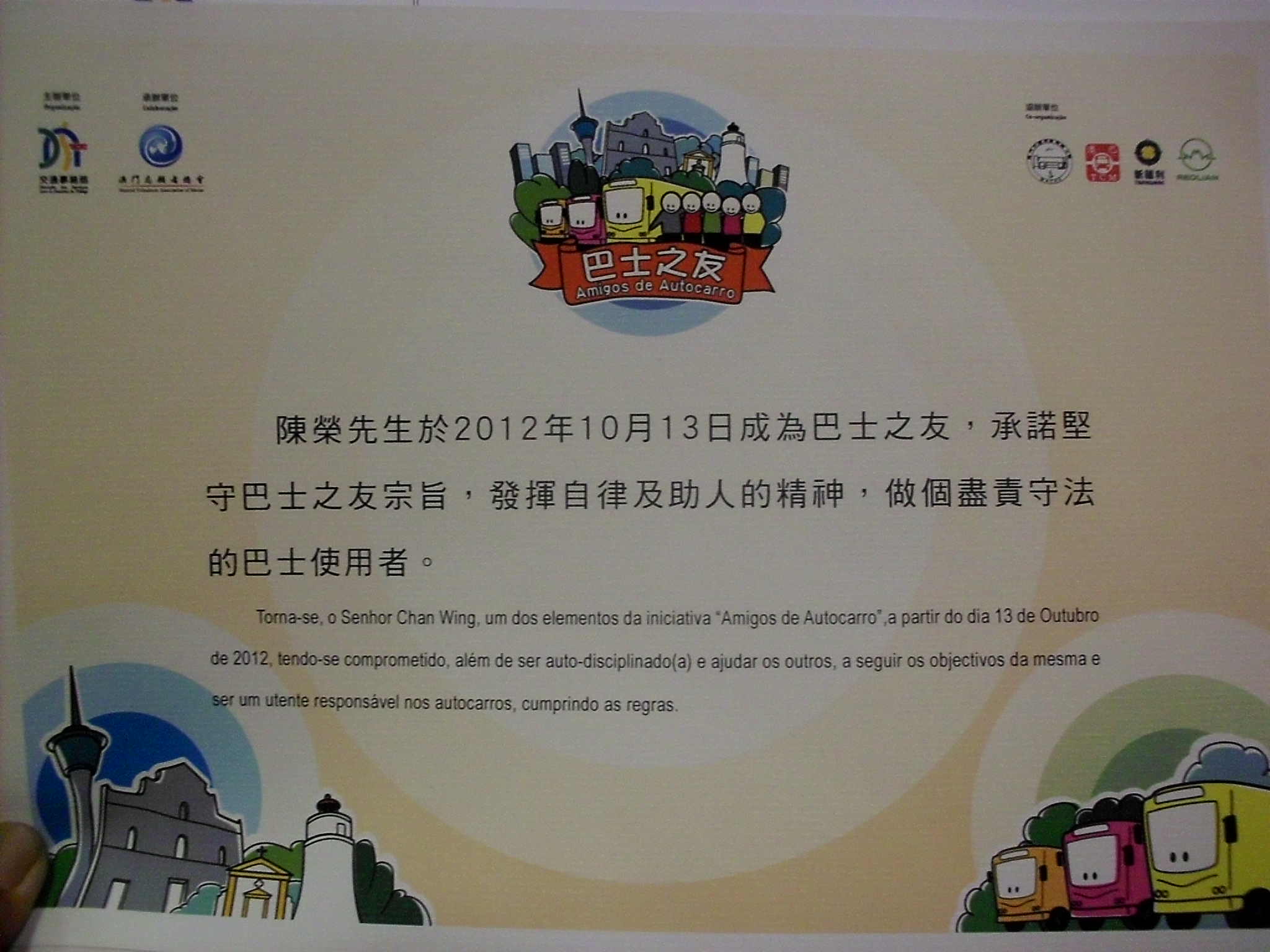 一個擁有兩岸四地駕駛執照的綠色出行志願者,為了響應環保集體運輸,讓他不留白,揮灑環保飛虎的翅膀,欣然參加「巴士之友」,為不斷優化巴士服務,令更能貼近及滿足居民和旅客需要,以乘客角度反映巴士服務的問題,不僅政府和巴士營運商需要全力開展工作,巴士使用者的直接參與也是非常重要的因素,希望從不同層面了解居民對巴士服務的意見,改善和提升巴士服務質素。當中涉及巴士車長服務的使命感、服務態度,巴士營運商設備及時改善和及乘客的權利與義務等,因應「文明出行」建議與跟進。