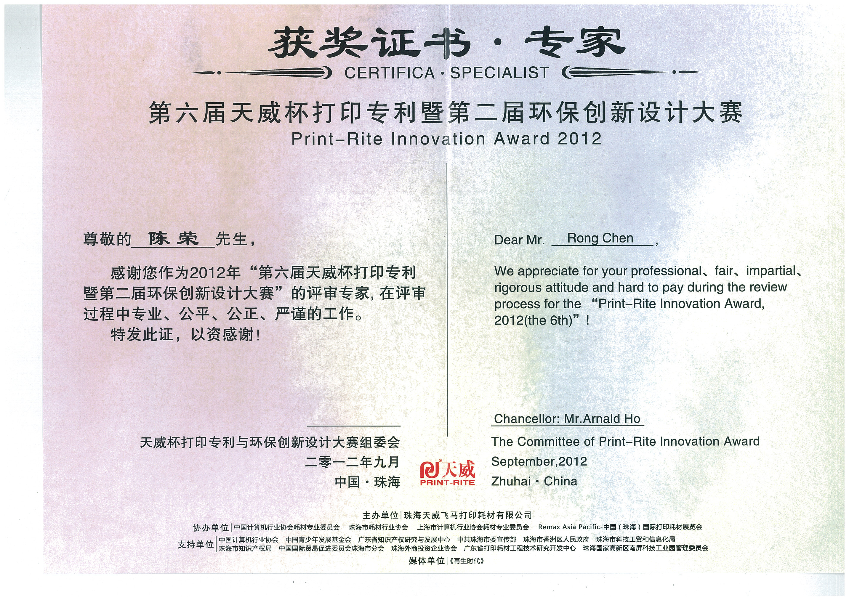 身兼環源科技實業有限公司首席顧問,擁有發明注墨專利,亦是綠色環境學會理事長长陈荣代表专家组发言:“本届大赛以“尊重知识产权、推动自主创新、共赢绿色经济”为宗旨,自6月30日大赛公告发布以来,评奖专家委员会对收到的“个人报名参赛”和“专家提名推荐”的145件专利作品逐一进行了评鉴。在资质审核、初审、一级复审阶段,經篩選,12件作品順利入围。在二级复审和答辩阶段,6件专利成为候选作品。终审阶段,该6件专利均获得各奖项提名,并在耗材行业协会的网站上进行了公示。在整个评奖过程中,评奖专家组本着公平、公正、公开的原则,按照客观的评审程序履行了大赛组委会的委托。希望通过参与本次大赛的活动,对推动个人、企业、行业尊重知识产权,提升中国兼容耗材自主创新能力,推动中国耗材行业的发展起到积极的拋磚引玉作用,也希望重視知识产权事业能为企业的发展壮大保驾护航。”
