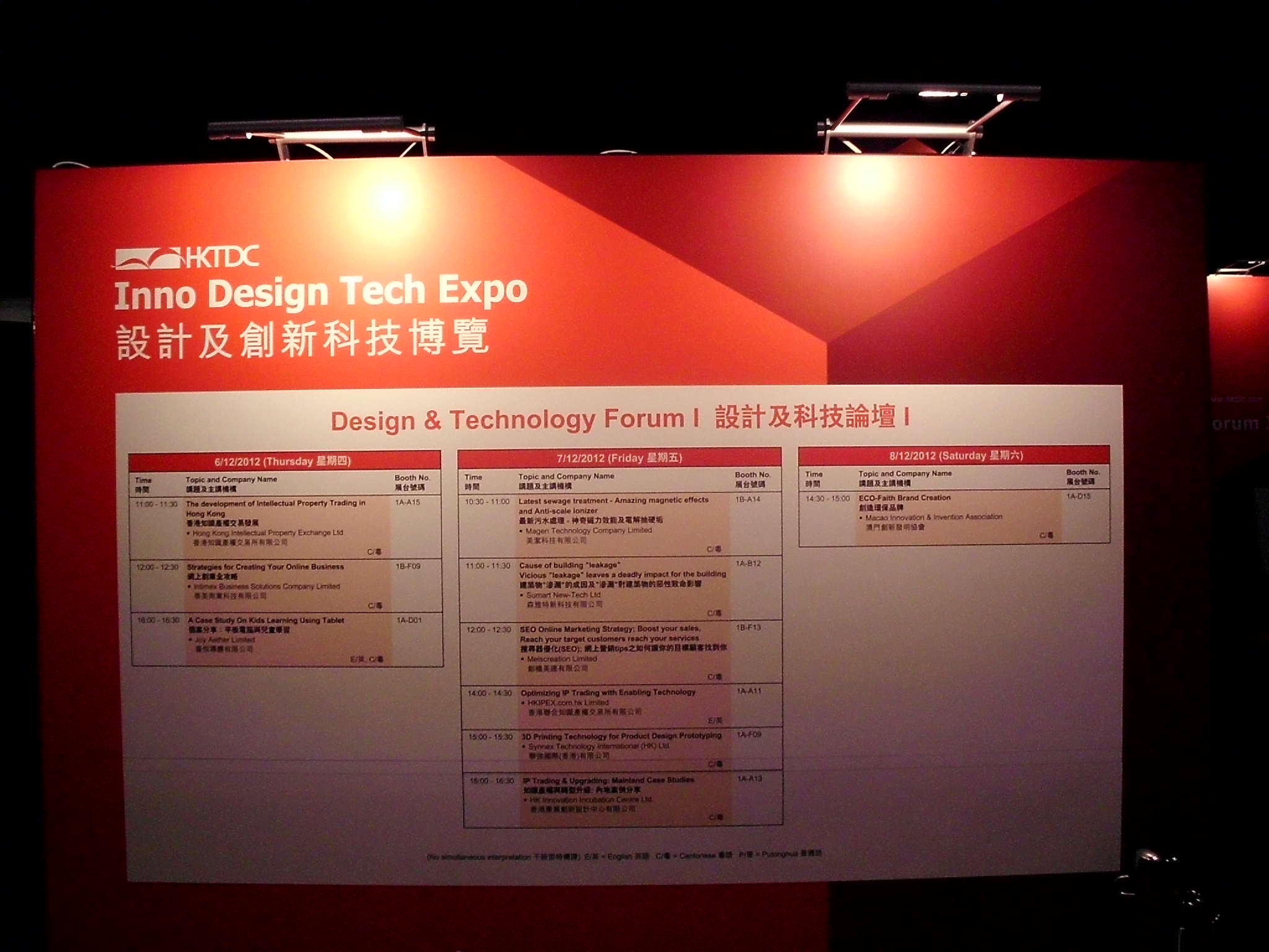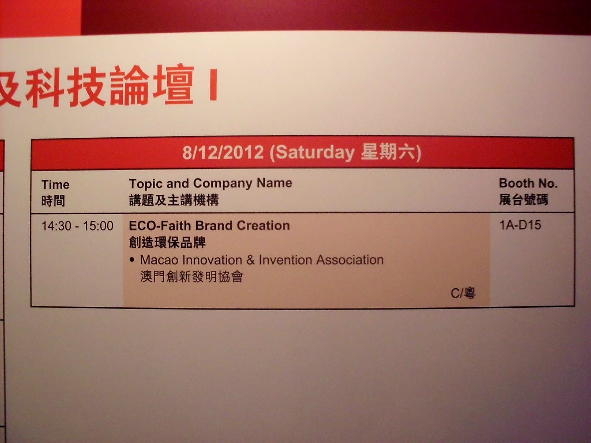 研討會方面,來自不同範疇的設計及商界精英,就熱門課題與參觀人士交流,主題包括融入智能科技的空間設計、雲端科技、手機應用程式及本澳商標品牌—「環保飛虎」○REco-Faith的授權推廣,平行、垂直的T型增強環保節能產品,已加盟的有環能科技的LED 節能燈、環源科技的環保伸縮筷子、澳門資訊顧問公司的環保袋、台灣的「環保家族」的環保皂及準備加盟的「環保青蛙」系列等,剖析如何能將「以人為本」的環保哲學應用於商業模式中。